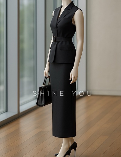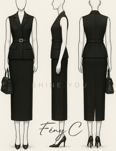 由無袖西裝上身與直筒裙構成,輪廓立體,線條果斷。肩膀線條與收腰設計刻畫出女性專業者的冷靜自信,而裙身長度則帶來份量感與穩重印象。裙身後開衩,行走時更添從容。單色設計宛如沉穩的注視,適合每一次關鍵的開場。